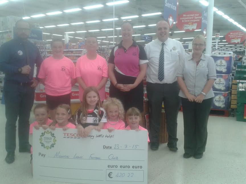 Many Thanks to Tesco for presenting Midleton Ladies Football with a cheque for €420.22. This was given to us as part of the Tesco Community Coin collection. A big Thanks to all those who kindly dropped their blue coins into the Ladies Football box. This donation will be put to good use on your behalf within the club.
