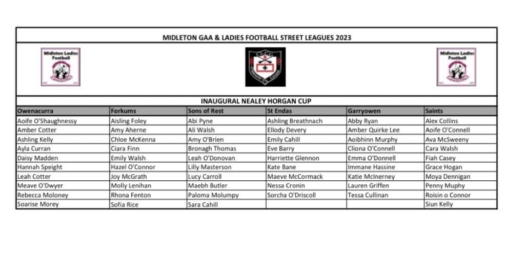 The rescheduled street leagues will take place next Monday and Wednesday in Park South from 7-8pm and next Saturday in Clonmult from 11-12am. Please come along and show some support to our young footballers.